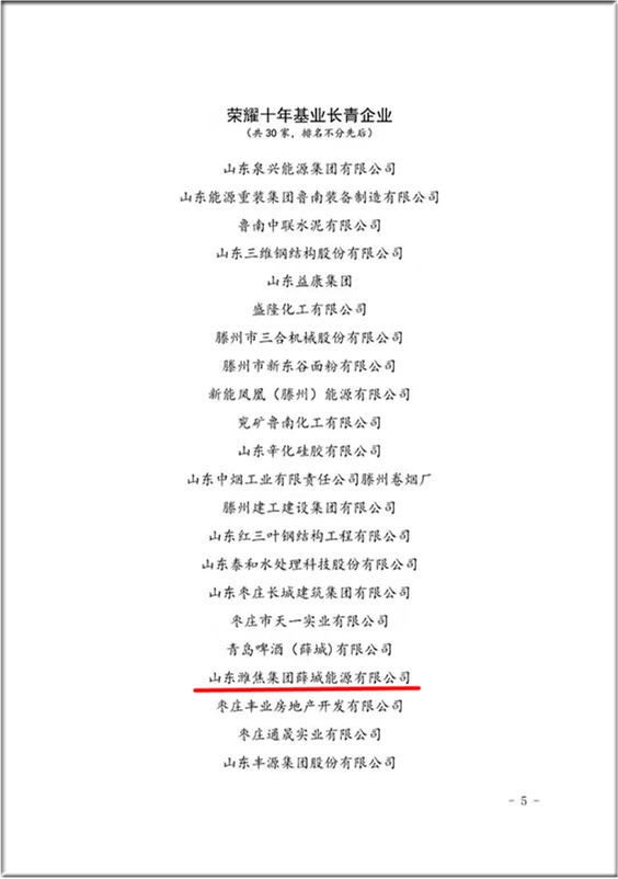 薛城能源公司荣获“荣耀十年基业长青企业”称号